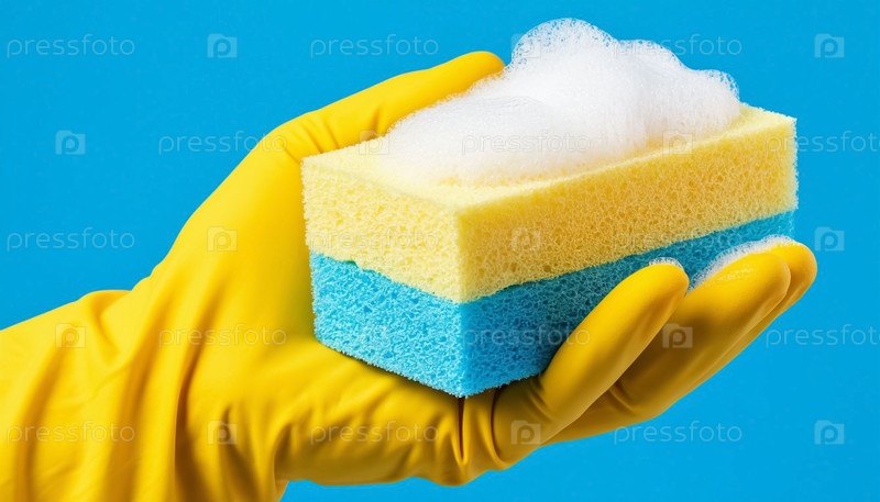 Рука в желтой перчатке, удерживающая мыльную губку для очистки концепции профессионального обслуживания