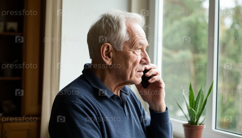 Пожилой мужчина разговаривает по телефону и одиноко смотрит в окно