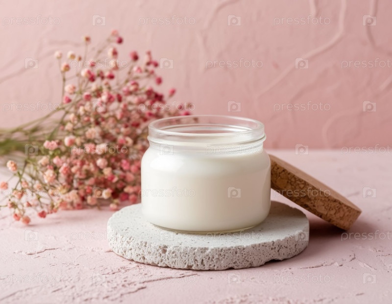 Бутылка с белым кремом на розовом фоне Стеклянная фотография продукта по уходу за кожей