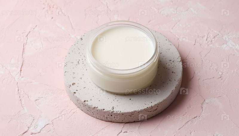 Крем в белом банке на розовом фоне, минималистский уход за кожей