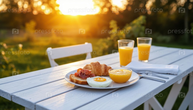 Завтрак подается на белой деревянной террасе, свежие утренние легкие обеды на открытом воздухе