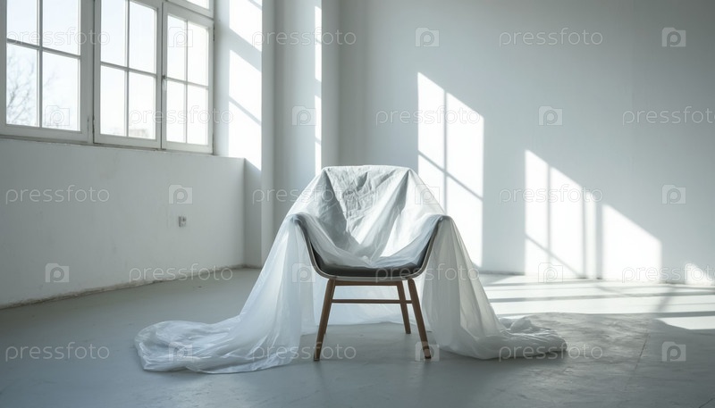 Покрытый полиэтиленом в пустой белой комнате Оконный световой стул