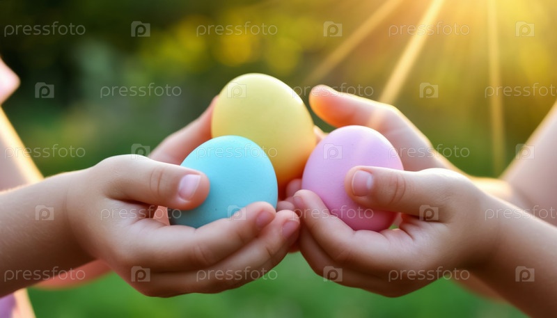 Детские руки, держащие пасхальные радужные яйца перед солнечной летней природой
