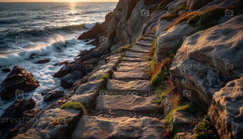 Морской пейзаж Природные скальные ступеньки спускаются в море