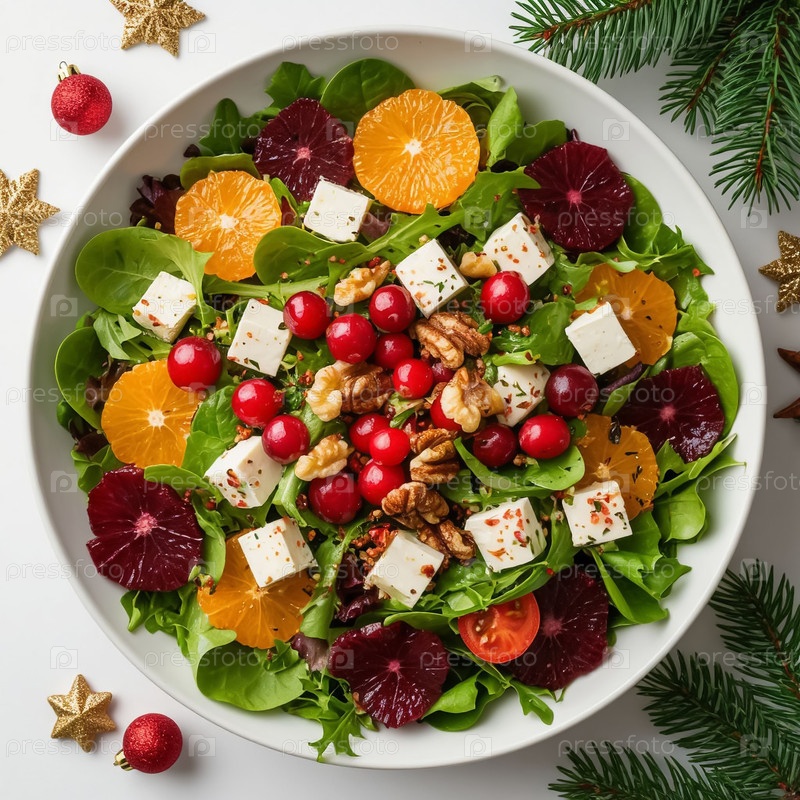 Праздничный праздничный салат, расположенный на белом столе для празднования