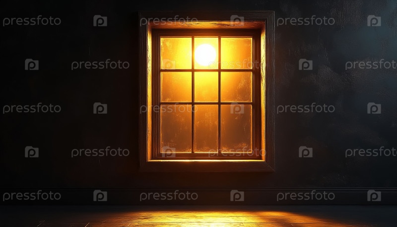 Окно с теплым желтым светом, сияющим на черной стене в темноте