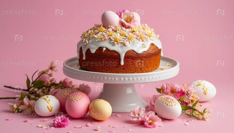 Традиционный русский пасхальный хлеб с красочными яйцами Мягкий розовый печатный лист