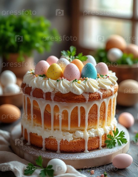 Элегантный праздничный пасхальный кулич на столе, украшенный праздничным хлебом