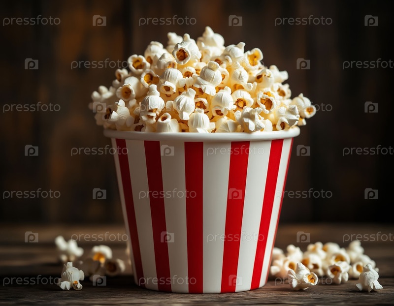 Контейнер с полосатыми попкорнами на текстурированном темном гранже Классическая кинематографическая фотография пищи
