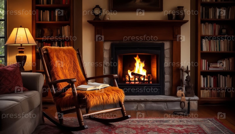 Качальный стул с одеялом от камина - теплый уютный интерьер