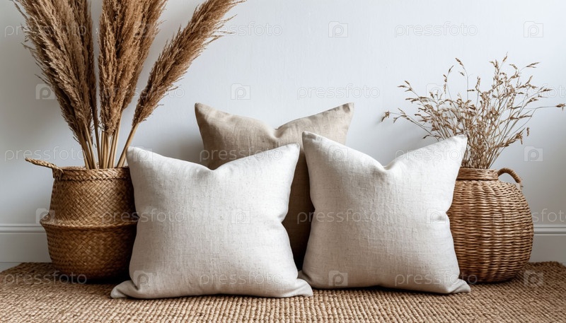 Белые льняные подушки из экотекстиля на полу от белой стены