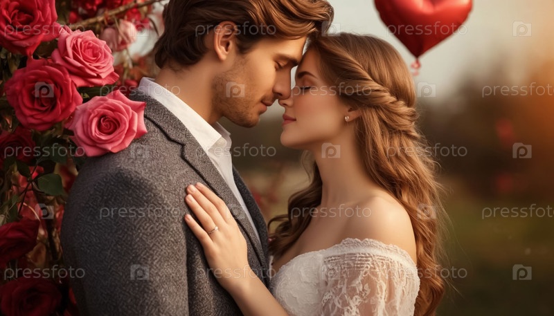 Влюбленные целуются в поле цветов День святого Валентина Фон для открытки или плаката