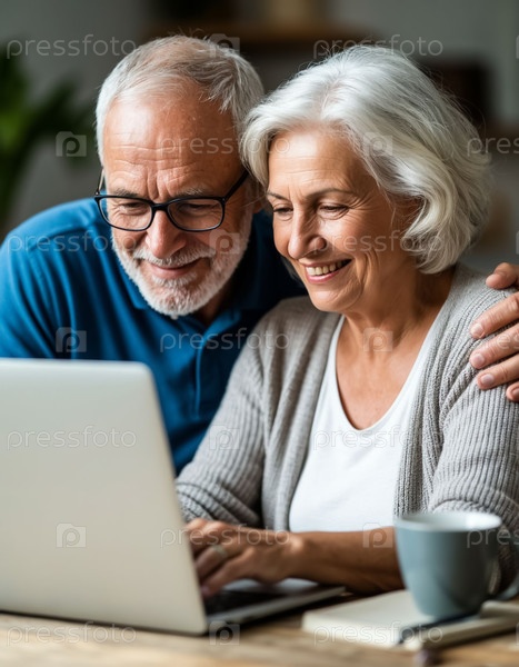 Зрелая пара обнимается во время просмотра веб-страниц на компьютере