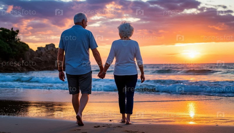 Зрелая пара, идущая рука об руку на береговом побережье в сумерки