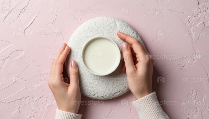 Женские руки, держащие белый кремовый горшок Top View Minimalism
