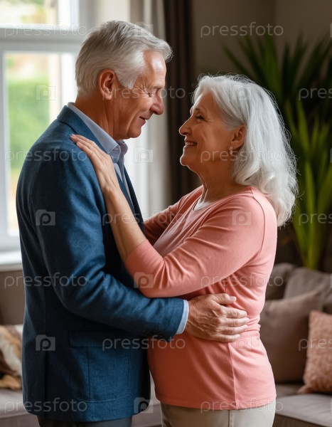Активная старшая пара наслаждается танцами вместе в гостиной
