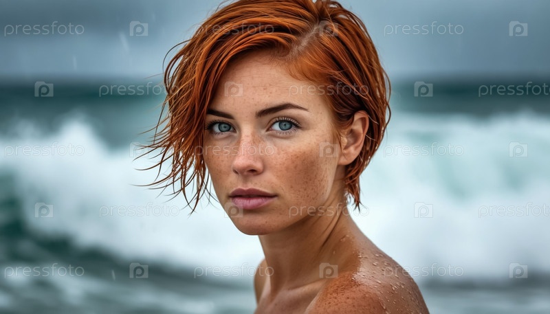 Спортивная рыжеволосая женщина в черном купальном костюме стоит на пляже с видом на море