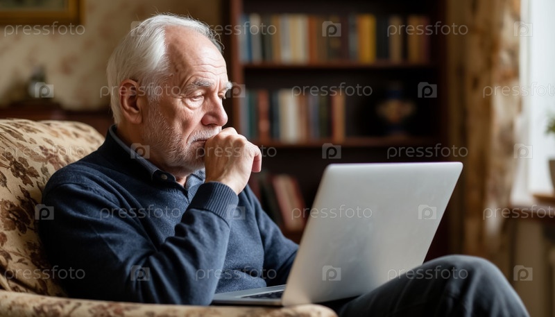 Старший человек мыслит и читает с помощью ноутбука дома для управления активами
