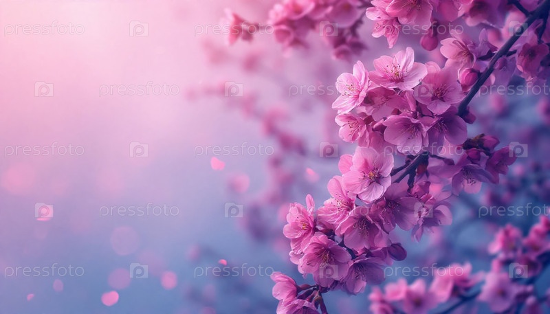 Мягкий магический лиловый фон с цветущими ветвями со стороны