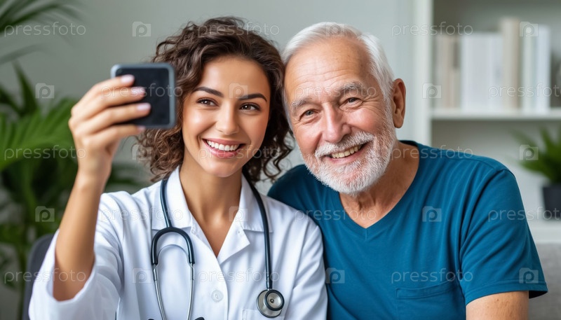 Пожилой мужчина и медицинский работник улыбаются для селфи, концепция ухода