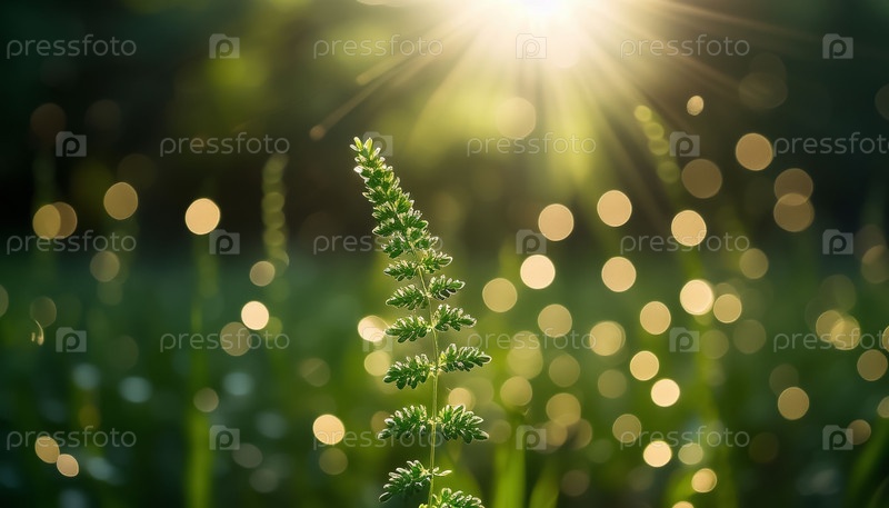 Боке от росы на траве при фоновом освещении, утром вблизи природы