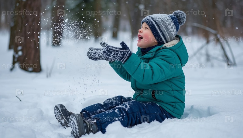 Счастливый мальчик, играющий в снежном дрейфе со снегом в солнечный зимний день