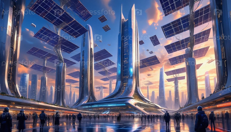 Футуристический город будущего с плавучими солнечными батареями в воздухе, чистой энергетикой и экологией