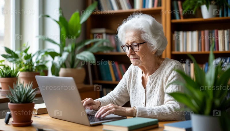 Пожилая женщина с белыми волосами и очками печатает на ноутбуке за деревянным столом