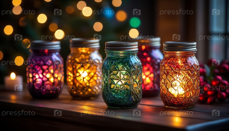 Праздничный радужный рождественский фон с светящимися масонскими банками и гирляндой, идеально подходит для праздничного маркетинга со копировальным пространством на стороне