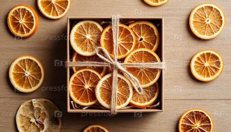 Сушеные кусочки апельсина в подарочной коробке, привязанной лентой, вкусное угощение