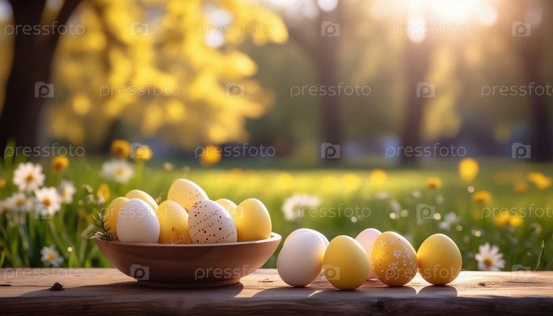 Деревянный стол с украшенными пасхальными яйцами на фоне природы