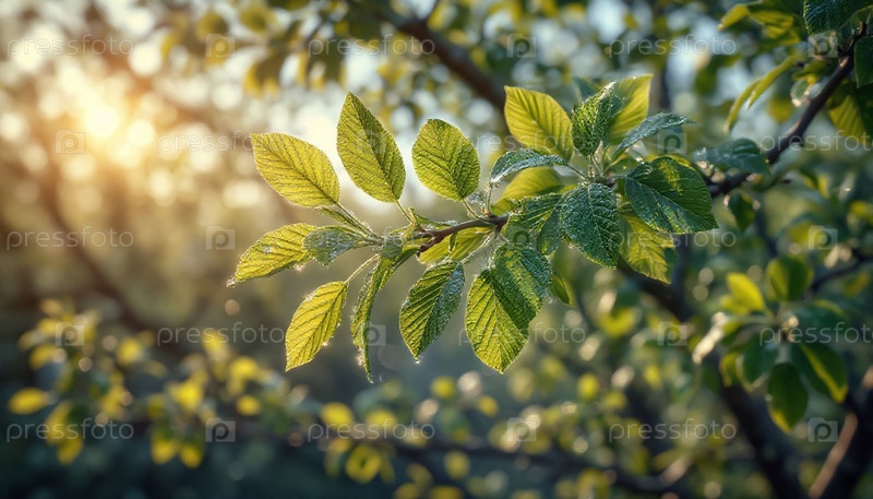 Зеленые молодые листья на ветке дерева в весеннем саду