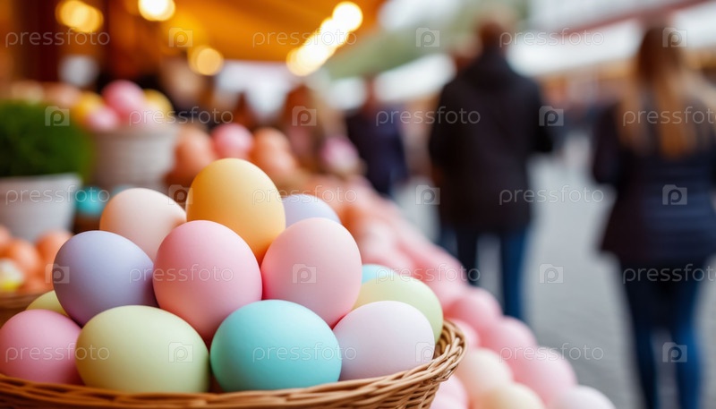 Пасхальный праздничный ярмарочный стенд с разнообразными пастельными цветными яйцами