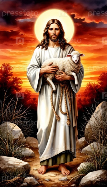 Христос держит ягненка среди шиповника Digital Art Banner
