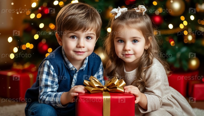 Маленькие дети с рождественскими подарками - праздничный портрет