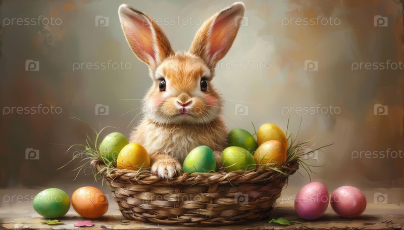 Пастельный рисунок пасхального кролика с красочными яйцами в корзине
