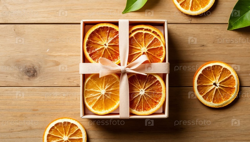 Сушеные кусочки апельсина в подарочной коробке, привязанной лентой, вкусное угощение