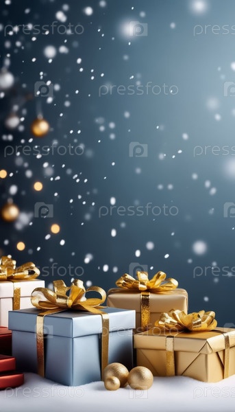 Золотые коробки для подарков на голубом снежном рождественском фоне