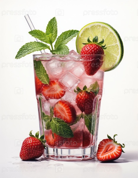 Свежее клубничное мятное мохито в высоком стекле на деревянном столе Top View
