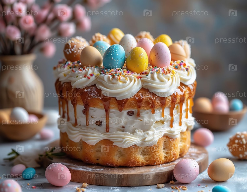 Элегантный праздничный пасхальный кулич на столе, украшенный праздничным хлебом