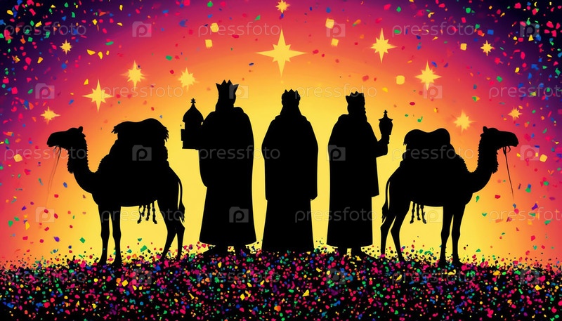 Силуэт трех мудрецов на звездах Конфетти Рождественская сцена