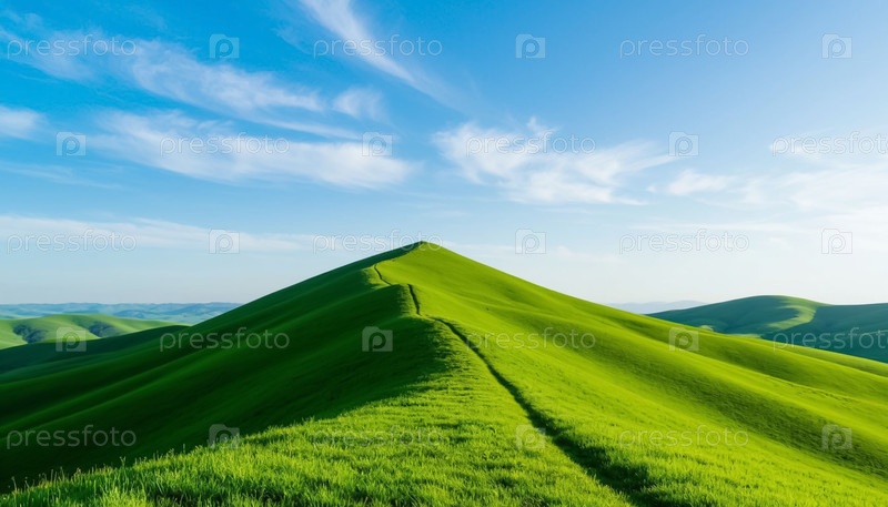 Вибрирующий зеленый Rolling Hills Under Sky with Clouds Минималистский одинокий холм