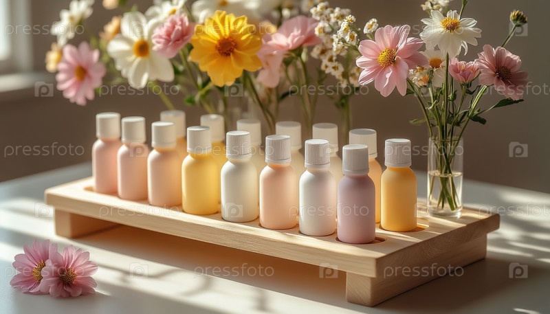 Пастельные мини банки на столе с цветами, уходом за кожей, косметикой, спа