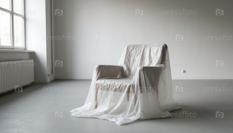 Пластиковый крытый стул в белой пустой комнате с естественным пластиковым светом