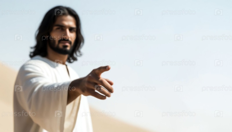 Иисус Христос в белом плаще, указывающий пальцем вперед Библейская сцена Духовное руководство