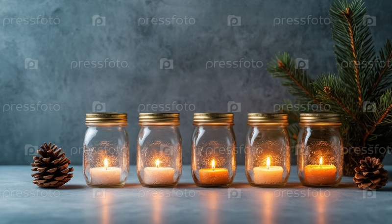 Рождественский фон с каменными банками, освещенными фейрическими огнями и чистым пространством для вашего текста на боковой стороне, идеально подходит для праздничного маркетинга