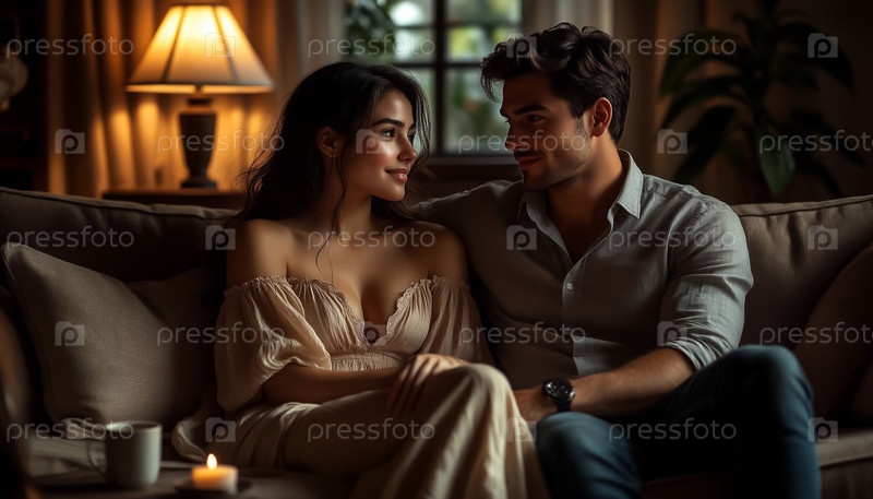 Уютная молодая пара обнимается на диване в домашних условиях Романтический вечер AI Красочная страница