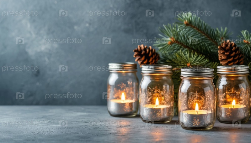 Рождественский фон с каменными банками, освещенными фейрическими огнями и чистым пространством для вашего текста на боковой стороне, идеально подходит для праздничного маркетинга