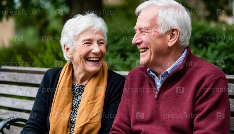 Счастливая пара пенсионеров сидит рядом и смеется