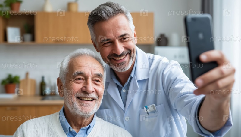 Пожилой мужчина счастливо делает селфи с опекуном, медсестрой